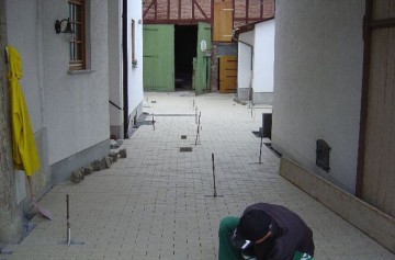 Home » Bildergalerie » Bautechnik » Detaillösungen » Die mitten aus der Pflasterfläche ragenden Schnurnägel dienen hier nur als Platzhalter. Verbaut wurden Lichtspots direkt im Pflasterbelag.