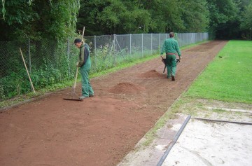 Home » Bildergalerie » Bautechnik » Detaillösungen » Nach dem Abtragen der ausgefrästen Bodenschicht wird neuer Tennensand aufgebracht und planiert