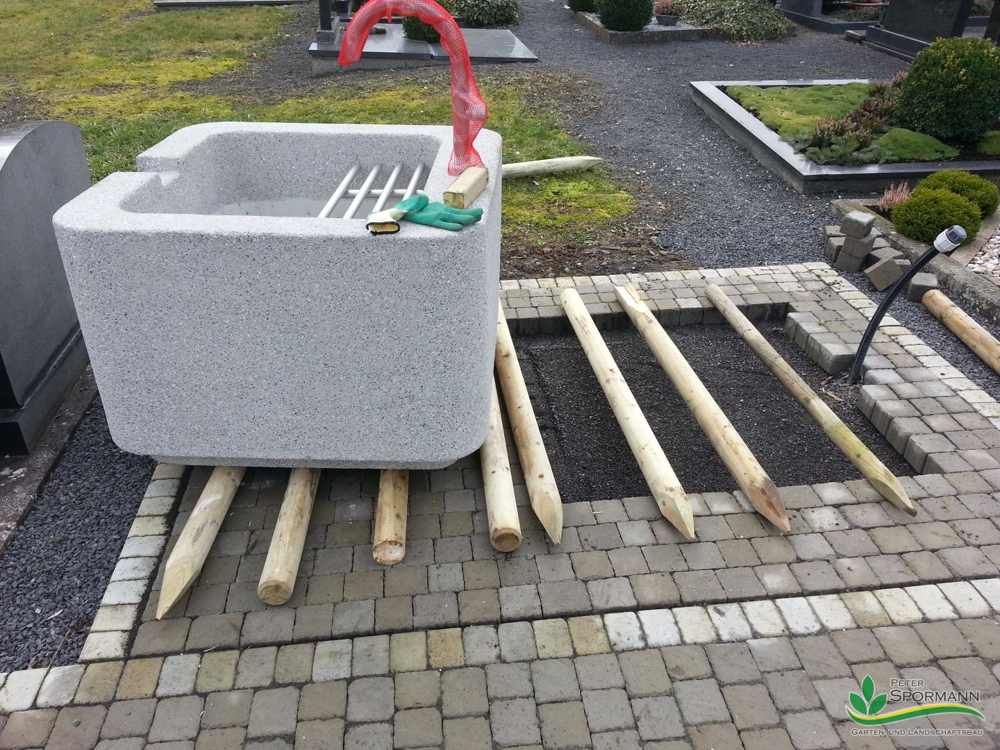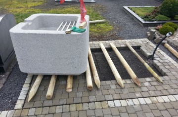 Hier der Einbau eines Naturstein-Schöpfbeckens auf einem Freidhof. Gewicht 2,8 to