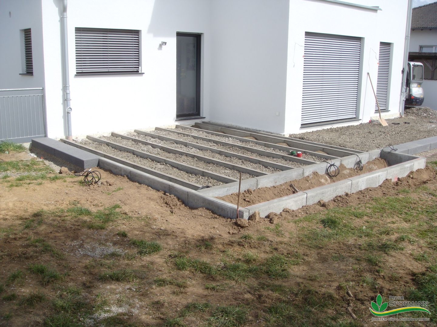 Sie befinden sich hier: Home » Bildergalerie » Bautechnik » Holz im Garten » Die fertige Unterkonstruktion für das Holzdeck aus Kantensteinen