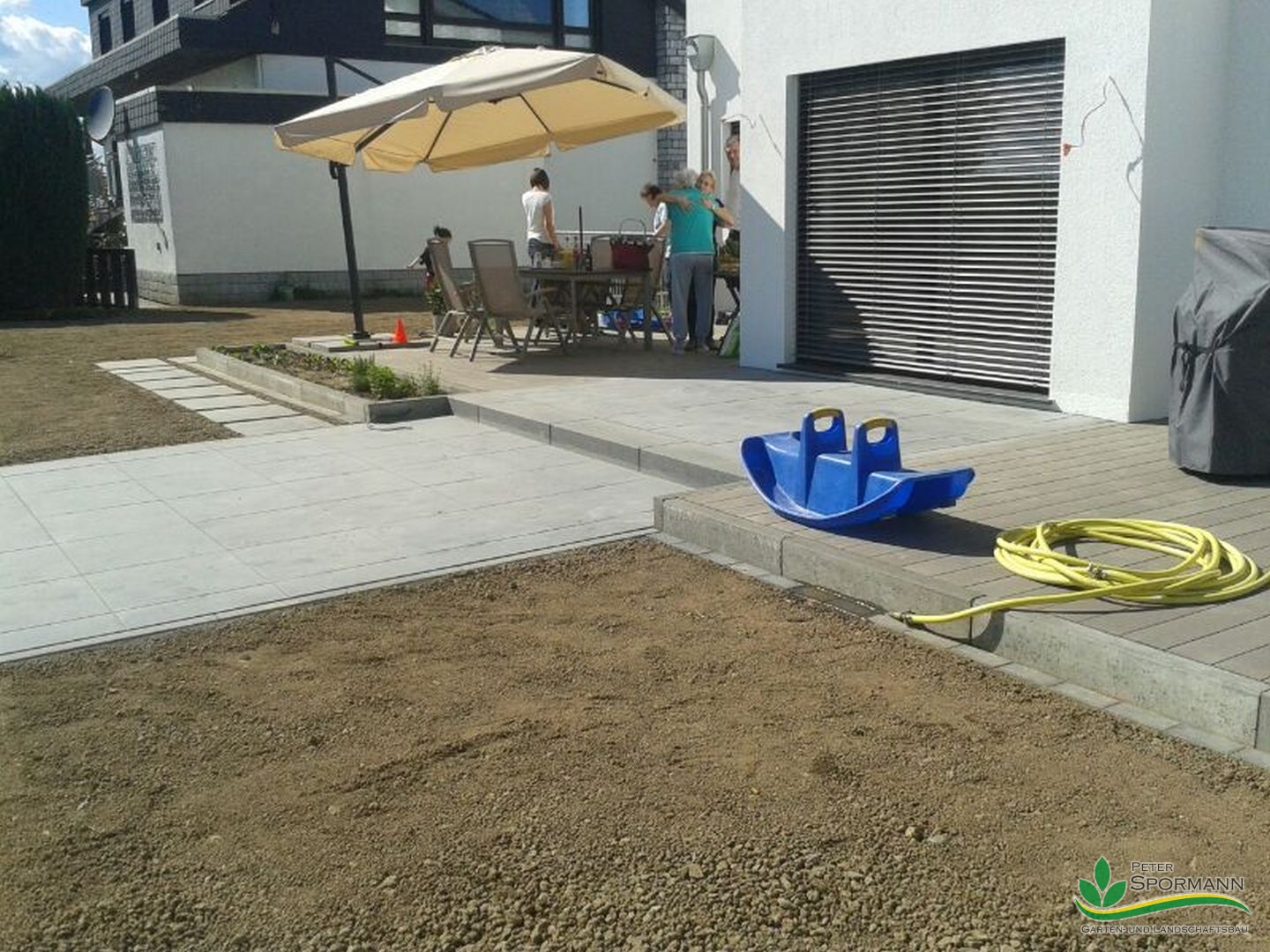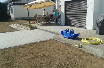 Home » Bildergalerie » Bautechnik » Holz im Garten » Plattenfläche Rinnit terralit Luna 60x60cm eingerahmt von zwei WPC- Decks von Terrafina