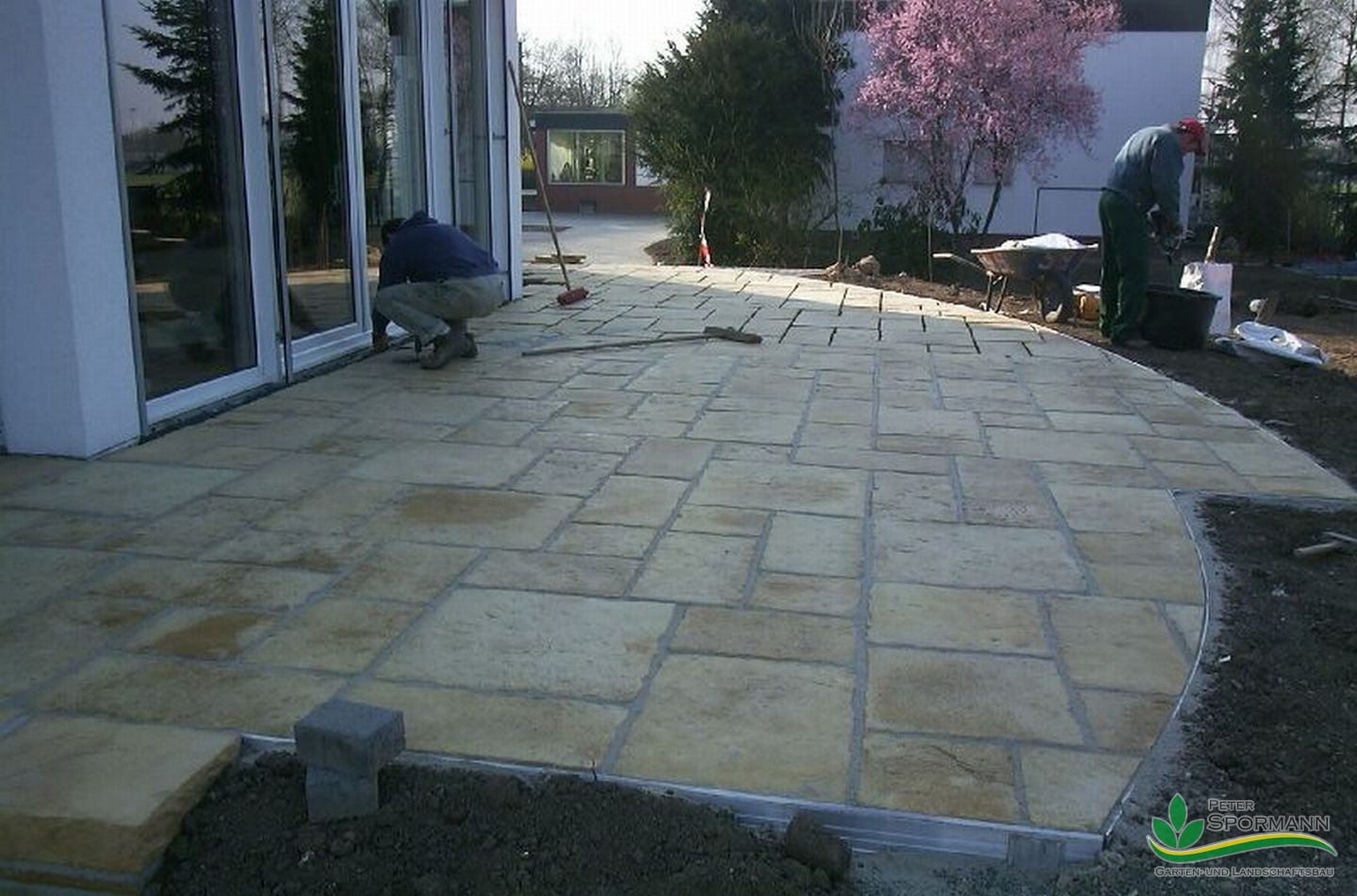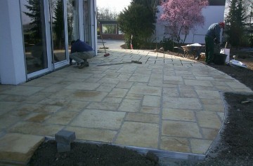Sie befinden sich hier: Home » Bildergalerie » Bautechnik » Naturstein und Naturbaustoffe im Gartenbau » Terrasse aus gelben Sandsteinplatten in gebundener Ausführung verlegt
