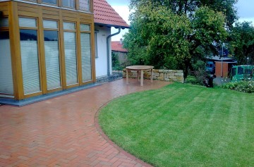 Home » Bildergalerie » Bautechnik » Naturstein und Naturbaustoffe im Gartenbau » Terrassenbelag aus Klinker im Fischgrätverband eingefasst vom gleichen Klinker, jedoch als Rollschicht verbaut