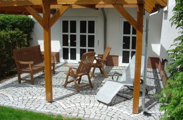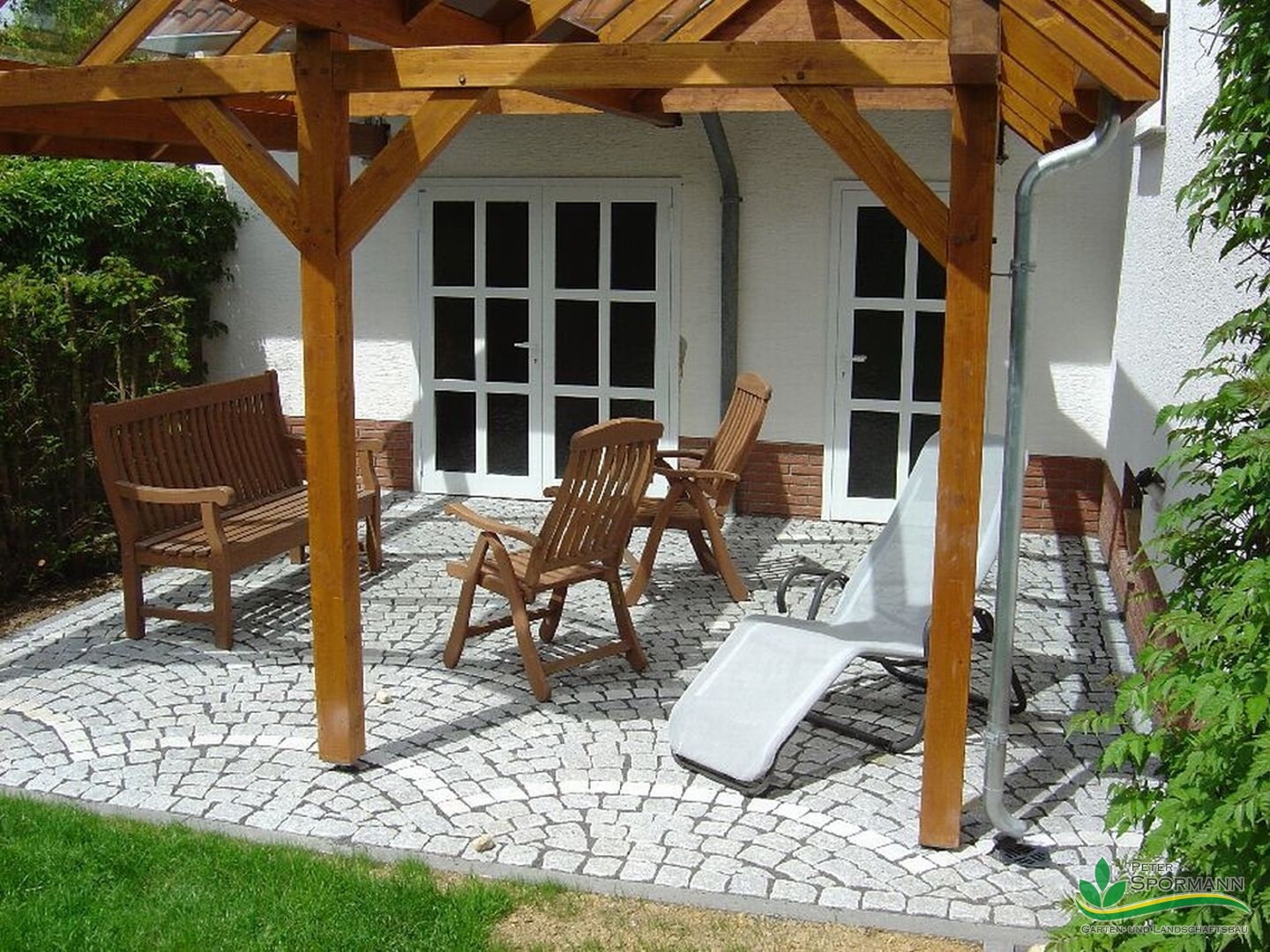 Terrasse mit zwei Sorten Granit in Segmentbögen verlegt