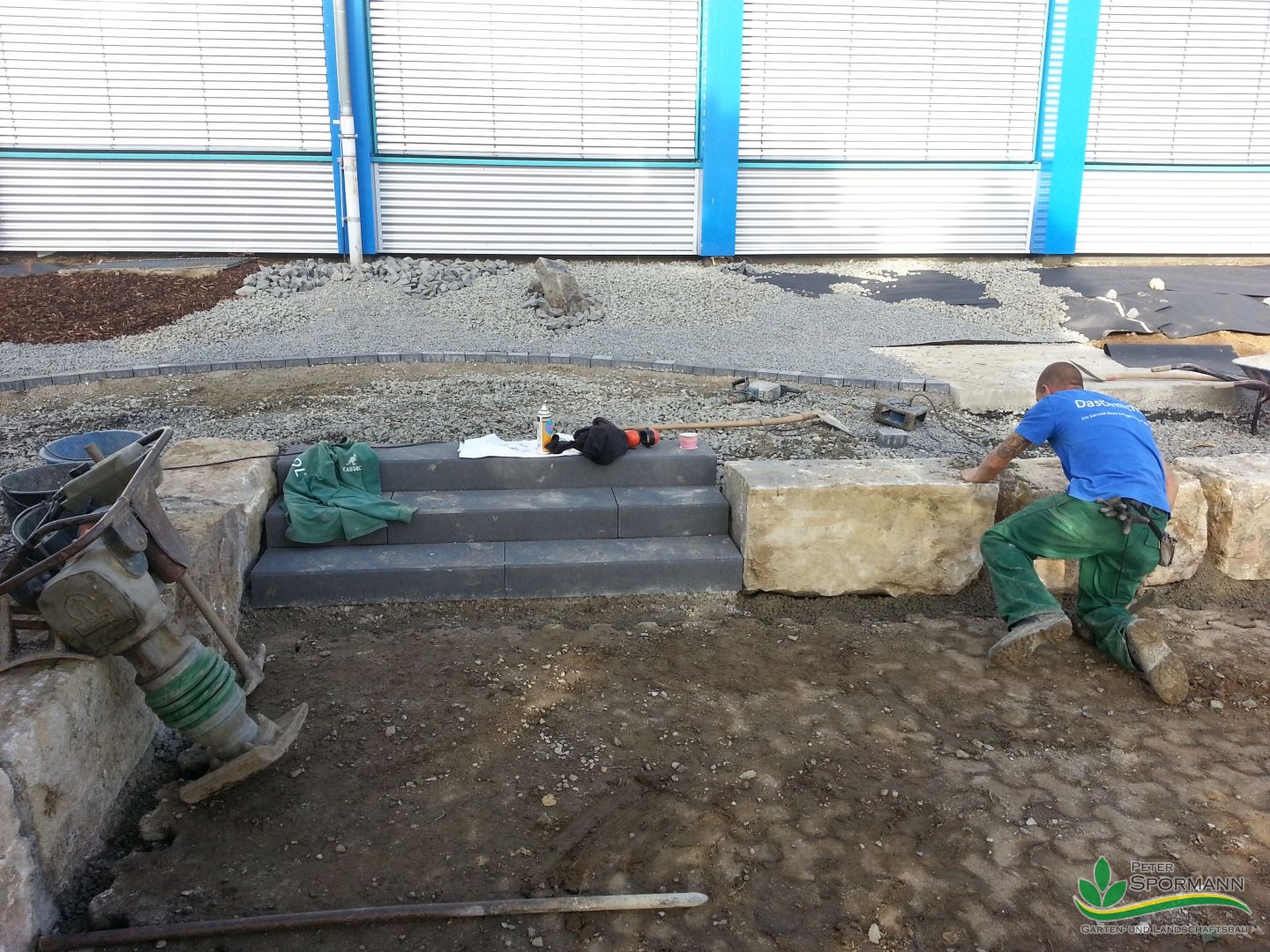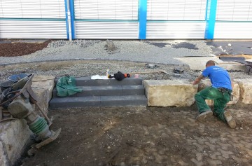Sie befinden sich hier: Home » Bildergalerie » Bautechnik » Naturstein und Naturbaustoffe im Gartenbau » Sitzmauer aus Muschelkalkquardern beim Einbau