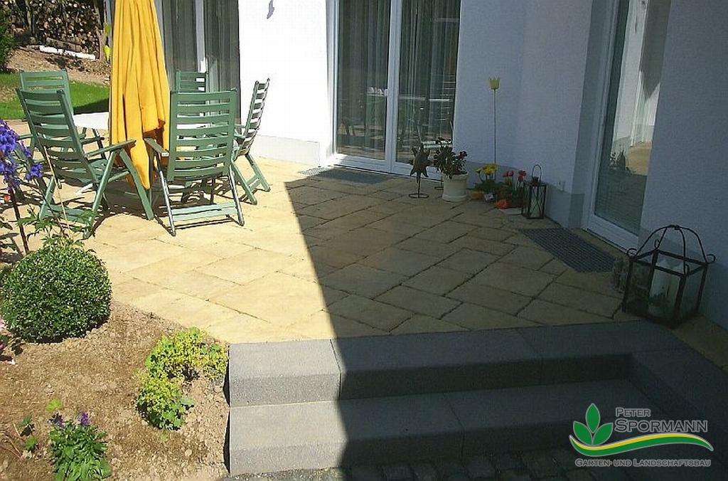 Sie befinden sich hier: Home » Bildergalerie » Bautechnik » Naturstein und Naturbaustoffe im Gartenbau » 21. Sandstein- Terrasse mit Betonstufen in der Oberfläche rinnit Basalt