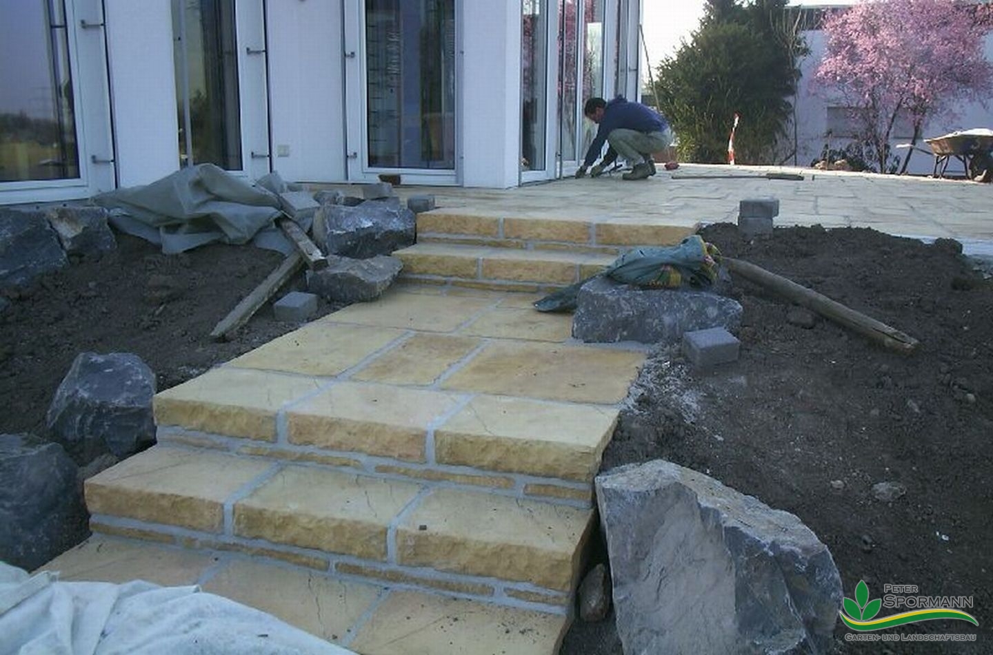 Sie befinden sich hier: Home » Bildergalerie » Bautechnik » Naturstein und Naturbaustoffe im Gartenbau » Stufenanlage aus Sandstein Legstufen