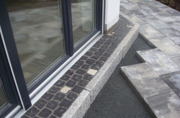 Stufe aus bruchrauhem Granit, im Austritt Basalt- Naturstein in gebundener Ausführung