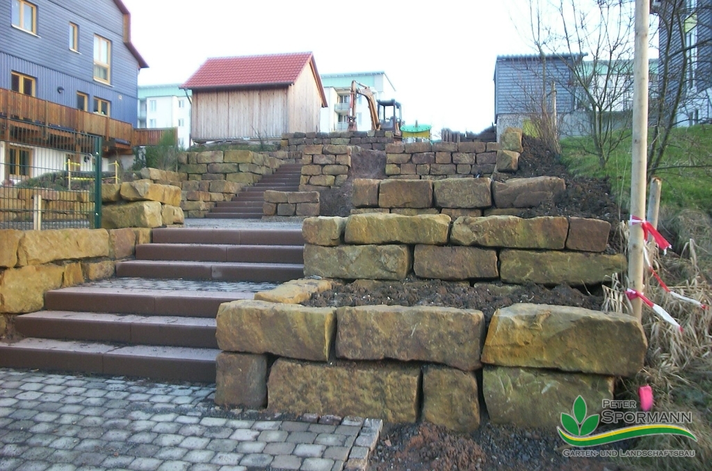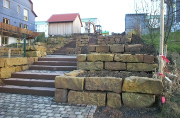 9. Mauern aus gelbem Sandstein, Stufenanlage sowie Podeste aus Betonstein
