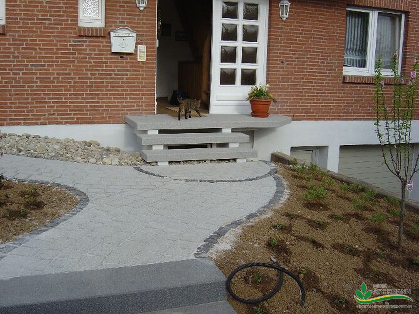 Eingangspodest sowie die dazugehörige Stufenanlage als Maßanfertigung durch die Fa. Rinn in der Oberfläche rinnit Granit