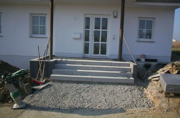 Home » Bildergalerie » Bautechnik » Treppenanlagen » Eingangspodest aus Betonpalisaden in color anthrazit, die Stufenanlage besteht aus Blockstufen in standard grau