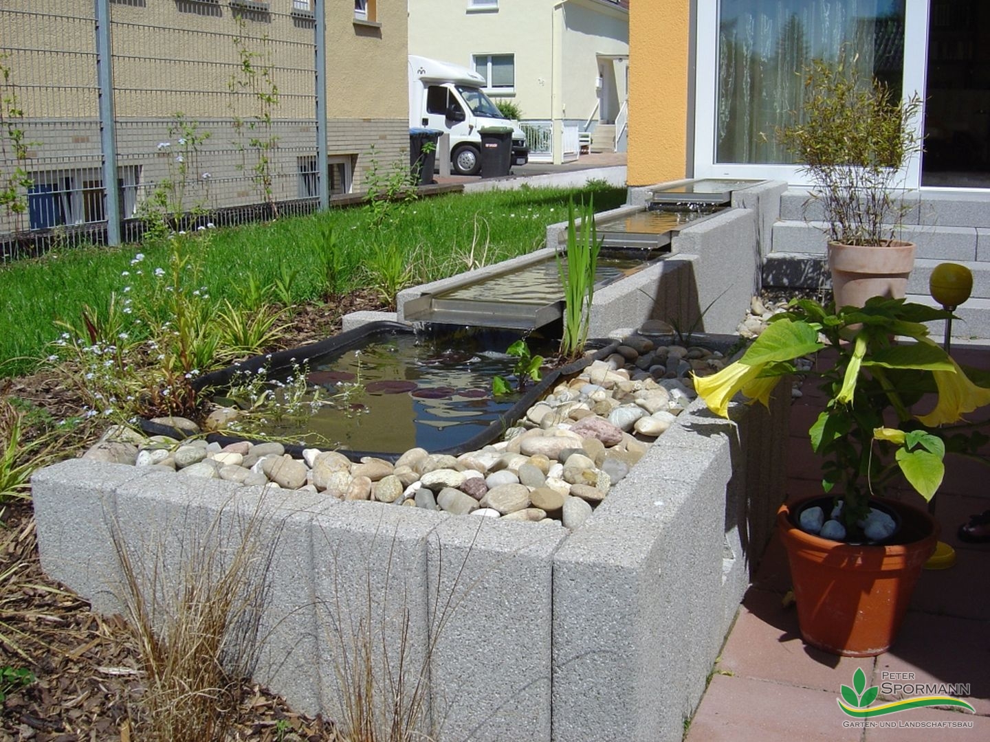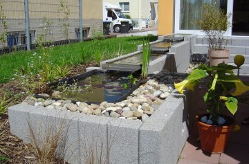 Home » Bildergalerie » Bautechnik » Wasser im Garten » Ein Kaskadenbrunnen nach den wünschen der Bauherrschaft – Das ganze wird eingefasst durch Betonpalisaden von Rinn