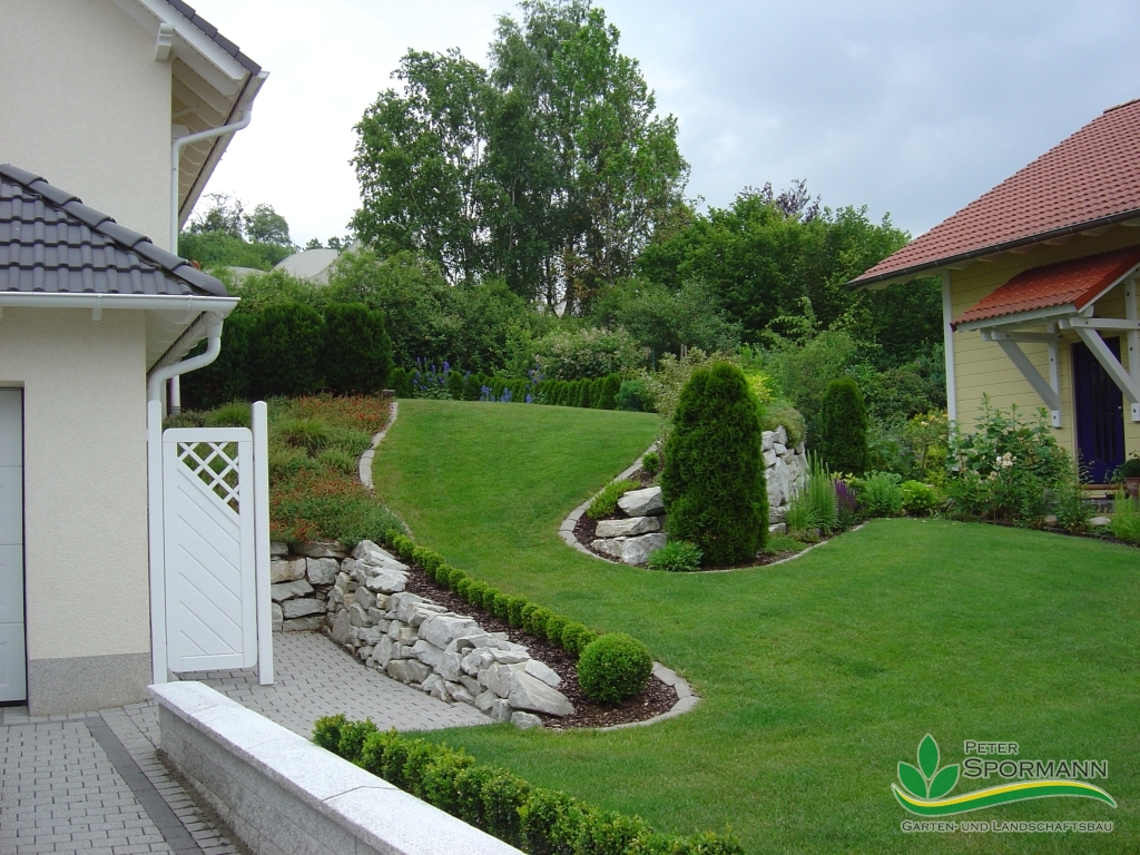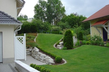 Ein gepflegter Rasen sowie die schöne Kombination aus Naturstein und Pflanzen- Wohlfühlen leicht gemacht