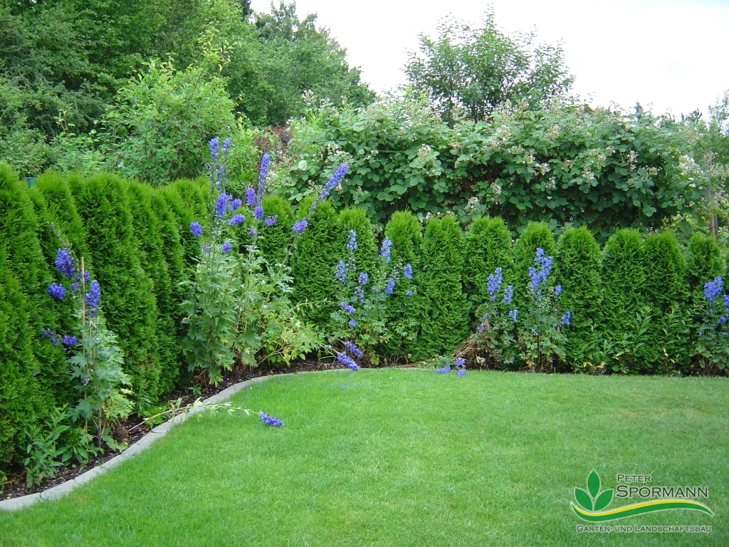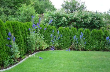 Sie befinden sich hier: Home » Bildergalerie » Vegetationstechnik » Pflanzarbeiten » Detailaufnahme mit der Thuja Hecke und geschickt davor platziertem Rittersporn