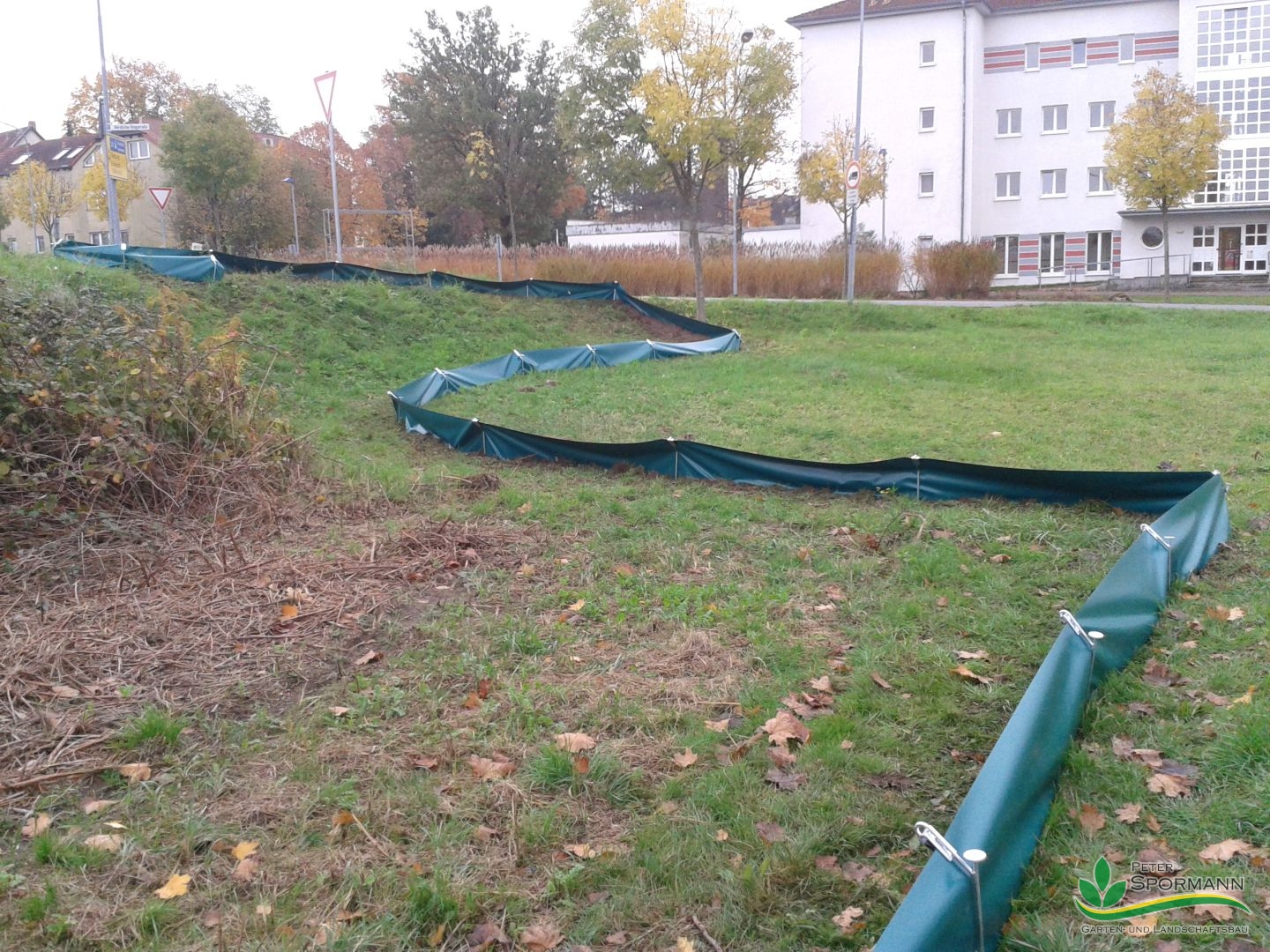 Im Bild der Amphibienschutzzaun, welcher vor dem Erweiterungsbau eines Supermarktes durch uns aufgestellt wurde, um die Amphibien zu schützen