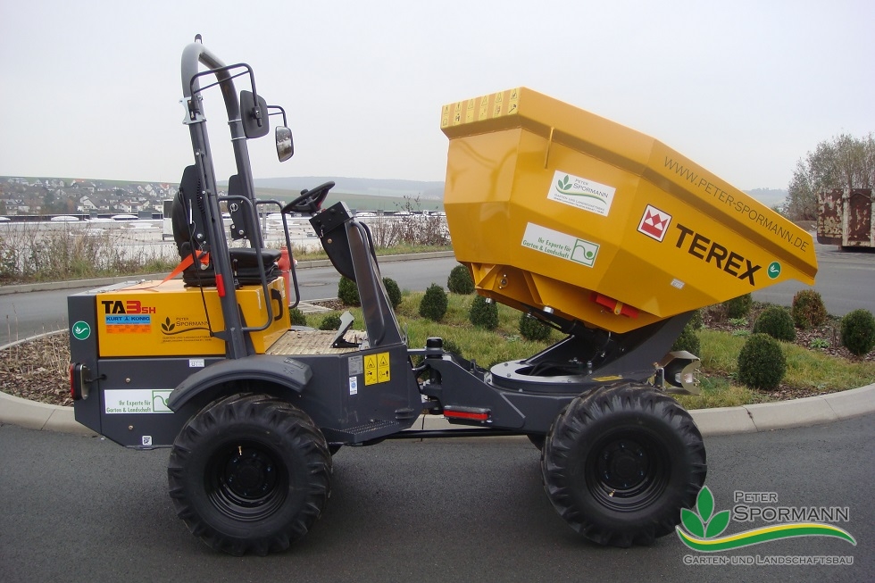 Pünktlich zur Adventszeit konnten wir eine neue Großmaschine in unseren Fuhrpark aufnehmen. Nachdem sich in diesem Jahr bei vielen Baustellen der Einsatz eines Raddumpers als vorteilhaft erwies, entschieden wir uns Anfang November dazu, in ein neues Gerät dieser Bauart zu investieren. Die Wahl fiel hierbei auf den Typ TA3SH vom Hersteller Terex. Mit einer Nutzlast von 3000 kg und einem Muldenvolumen von etwa 2000 ltr, wird uns dieses Gerät dabei helfen, die Bodenverdichtungen zu minimieren und auch unter schwierigsten Geländebedingungen große Materialmengen transportieren zu können.