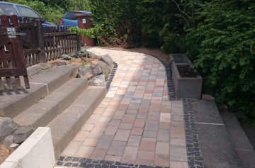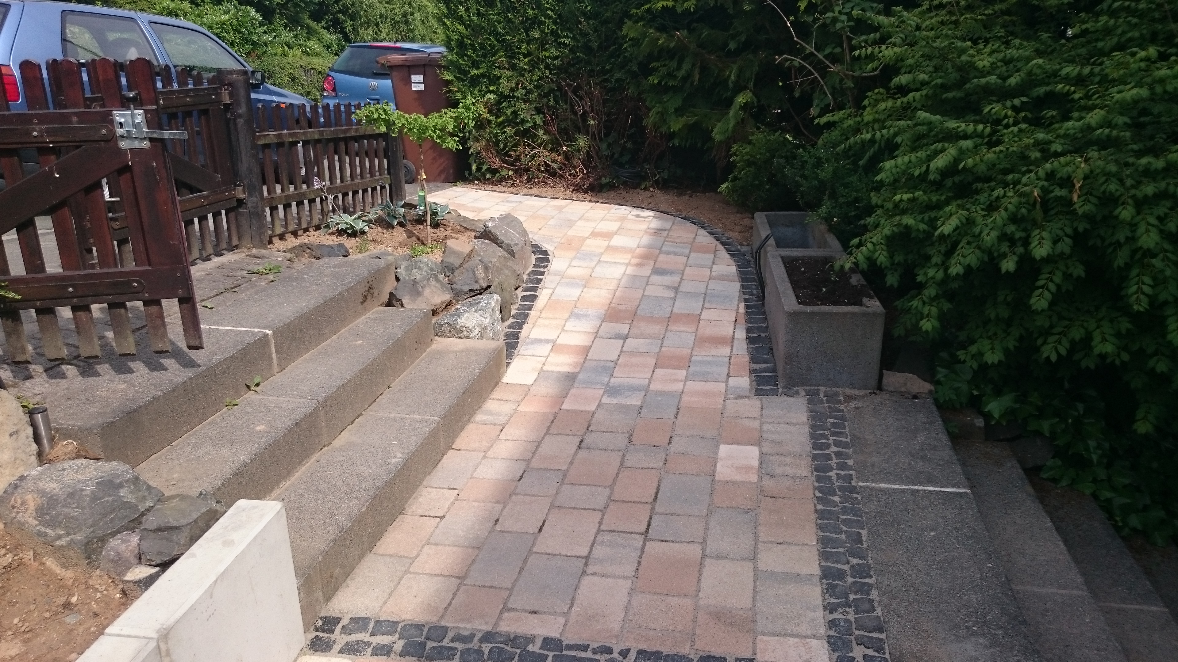 Das letzte Stück des neuen Zugangs vom Treppenplateau bis zur Grundstücksgrenze. Die Blumenkübel sind aus dem Altbestand und konnten hier perfekt mit eingebunden werden