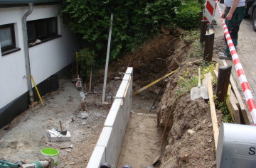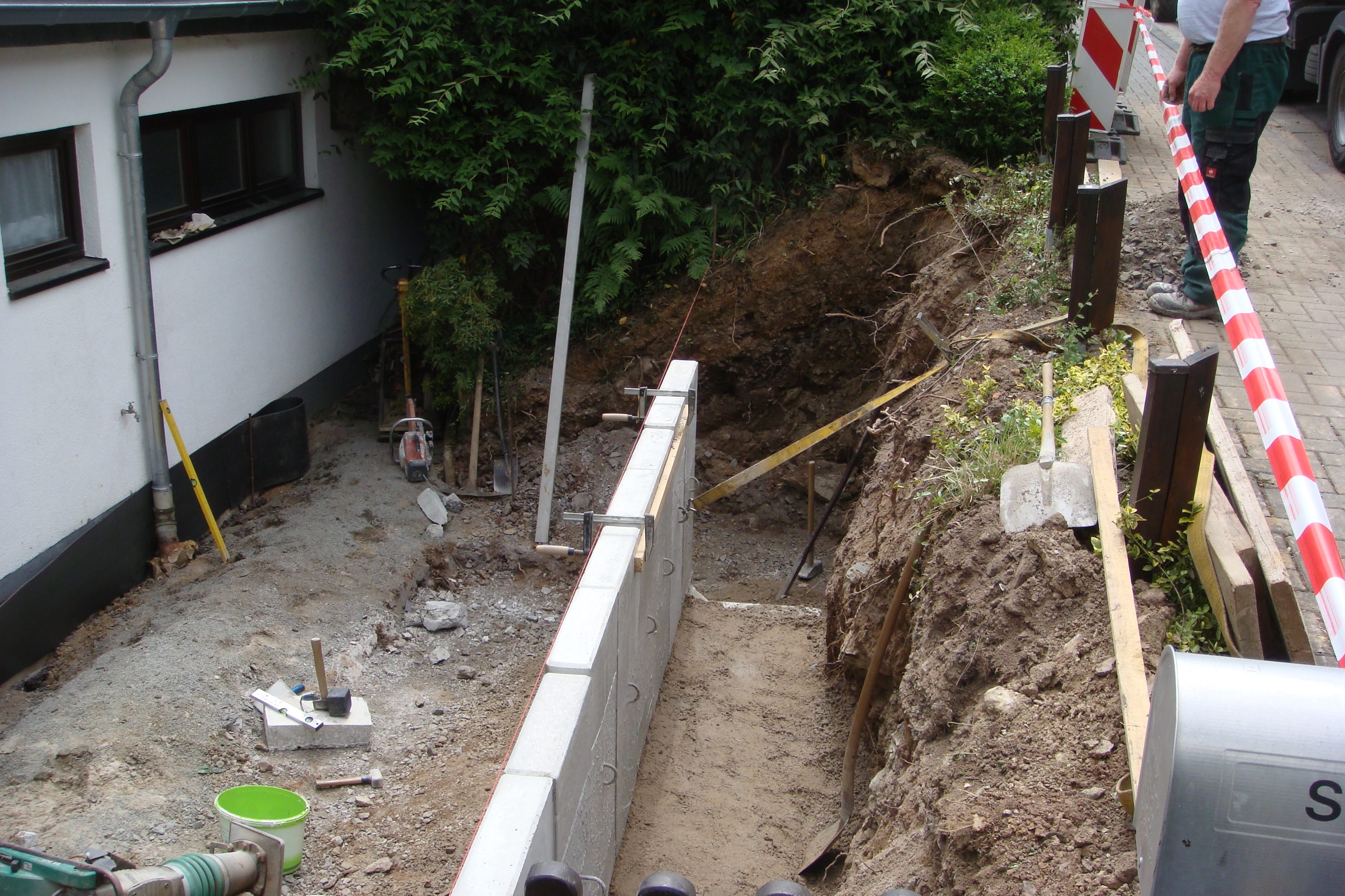 Nach dem kompletten Roden der Bepflanzung wurde mit der Erdarbeiten begonnen. Hier wurde bereits der alte Verbindungsweg entfernt und die erste Winkelsteinmauer ist im Bau