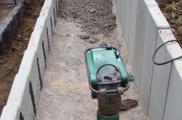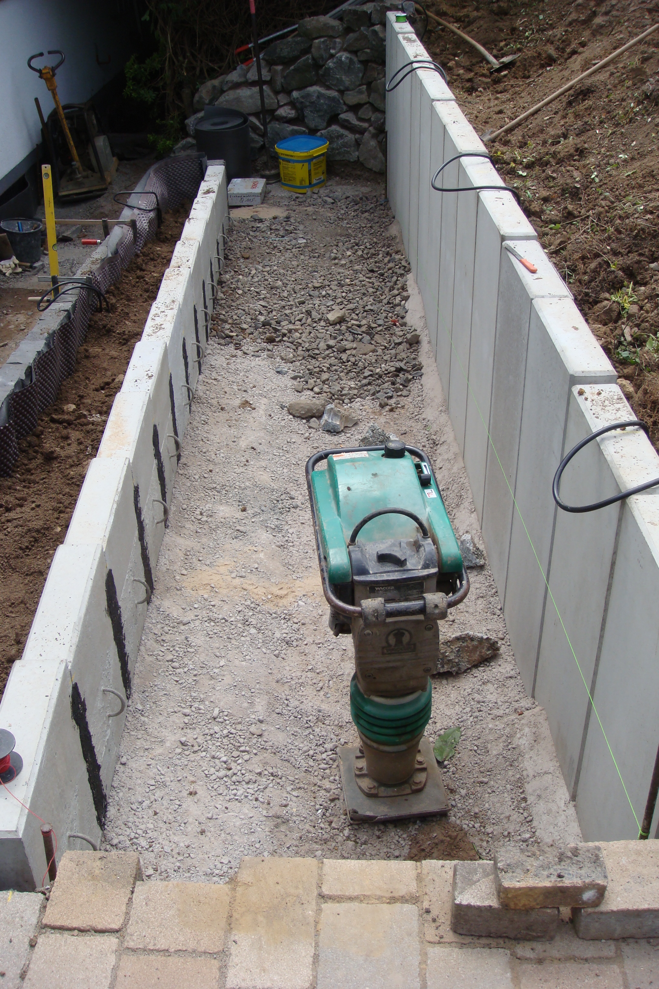Home » Der neue Hauszugang für Jung und Alt » Aufbau der neuen Tragschicht für den barrierefreien Zugang. Über den Winkelsteinen liegen hier die Stromkabel für die Beleuchtung der Anlage