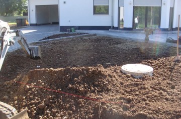 Home » Neugestaltung eines Einfamilienhauses im Westerwald » Vor dem Mutterbodenauftrag wurde der Unterboden tiefgründig mittels Reißzahn gelockert und anschließend vorplaniert