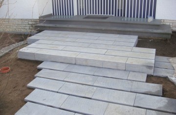 Home » Umgestaltung eines Vorgartens ins Wetzlar » 4. Blick auf das Eingangspodest aus Muschelkaltstufen mit Schattenfuge, alles auf Maß gefertigt